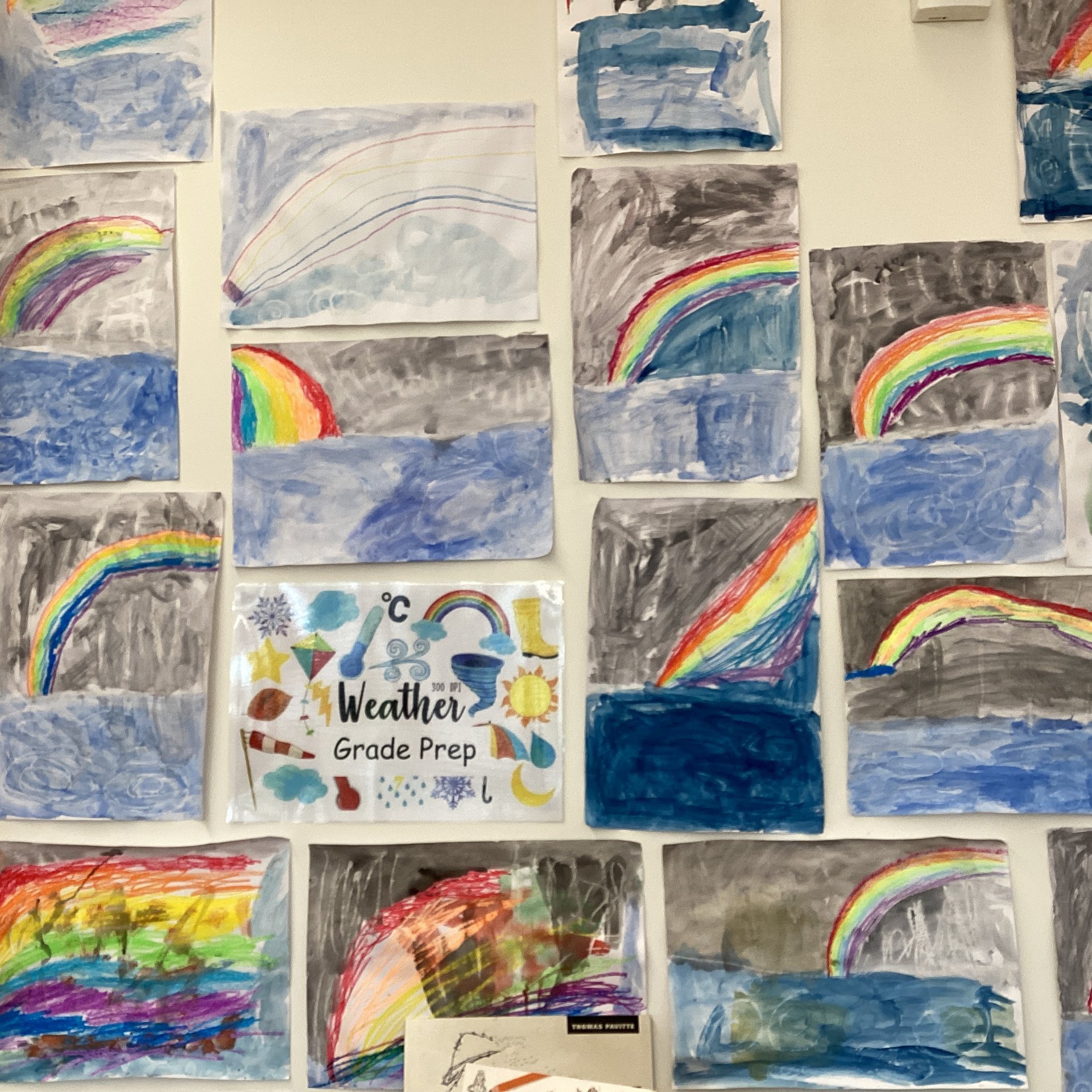 Grade Prep have been using a range of art techniques to create artworks about weather. In the photographs shown they experimented with wax resist watercolour paintings.